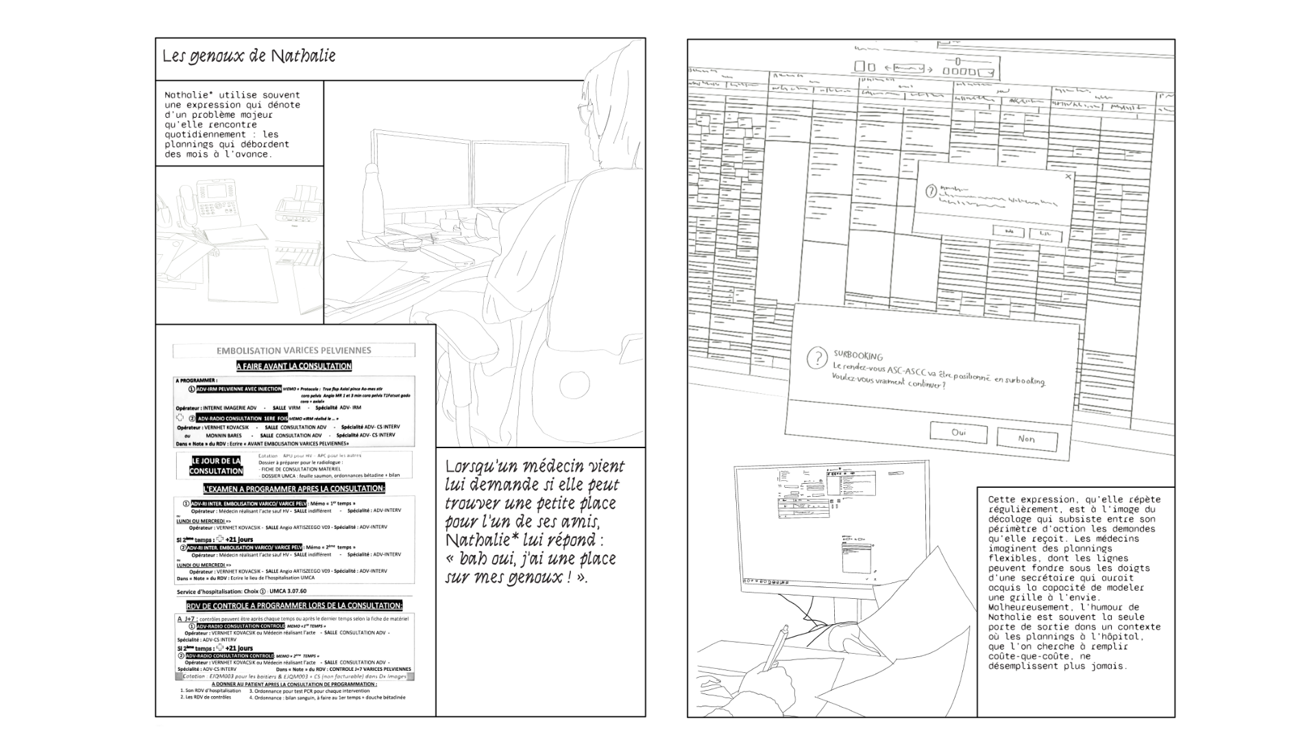 Derrière chaque consultation, chaque opération, chaque examen à l’hôpital, il y a une rencontre entre une équipe soignante et des patient·es permise par des objets graphiques (plannings, agendas, tableaux, logiciels, etc.) et leur gestion par des secrétaires médicales. Ce chapitre examine les logiques temporelles du travail hospitalier à travers les opérations de programmation prises en charge par les secrétaires médicales. Les secrétaires occupent une position charnière entre ces temporalités, ajustant sans cesse l’organisation collective pour faire tenir ensemble l’agenda du médecin et le planning du service. Ce travail s’appuie sur des compétences fines de lecture et d’anticipation permettant de soutenir une certaine « souplesse » des opérations de programmation. Finalement, si les secrétaires organisent le temps des autres, leur « temps à elles », celui de leur travail, peine à se rendre visible dans l’organisation complexe des hôpitaux.