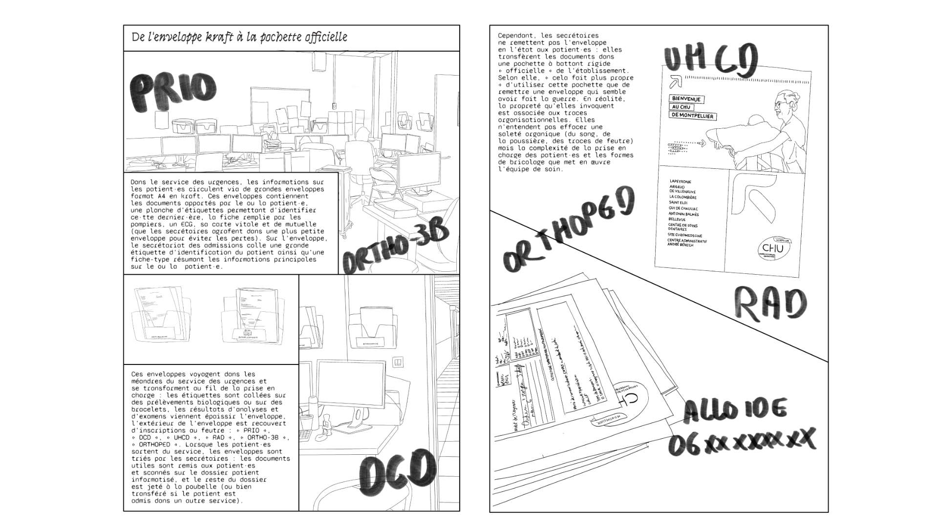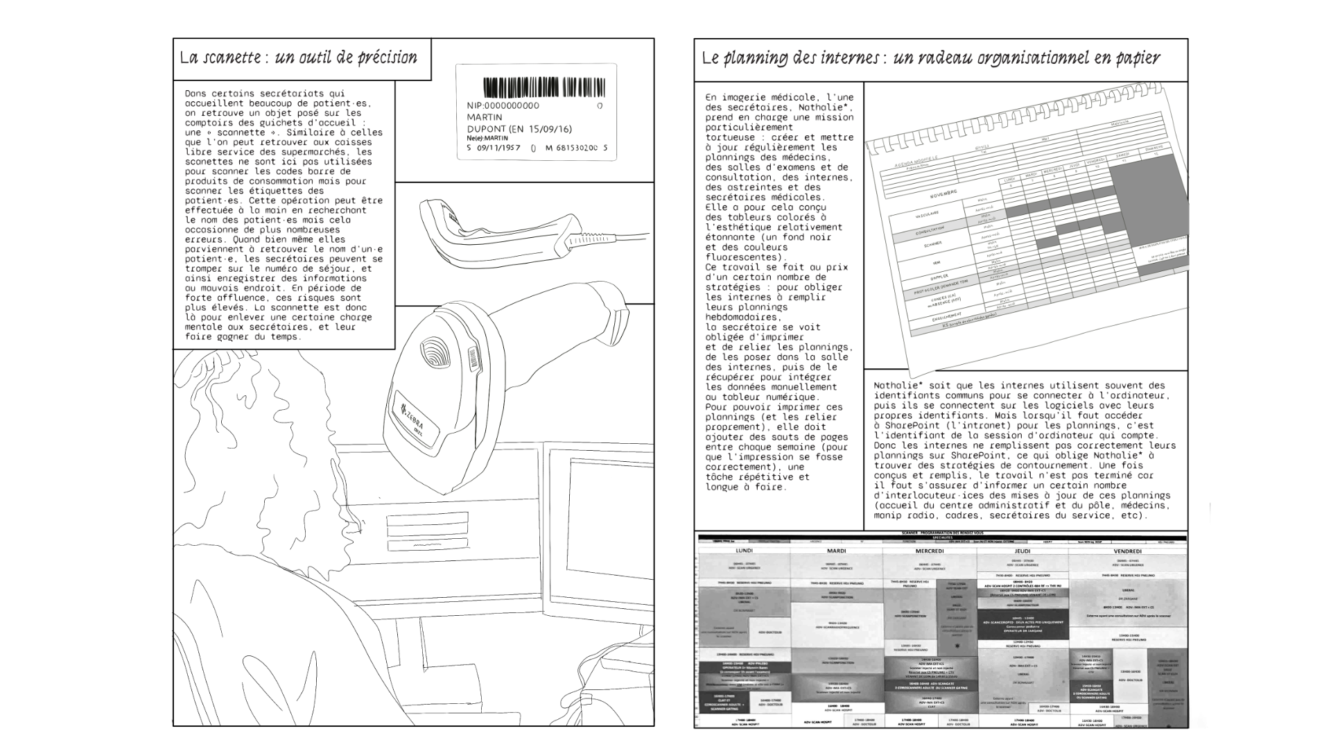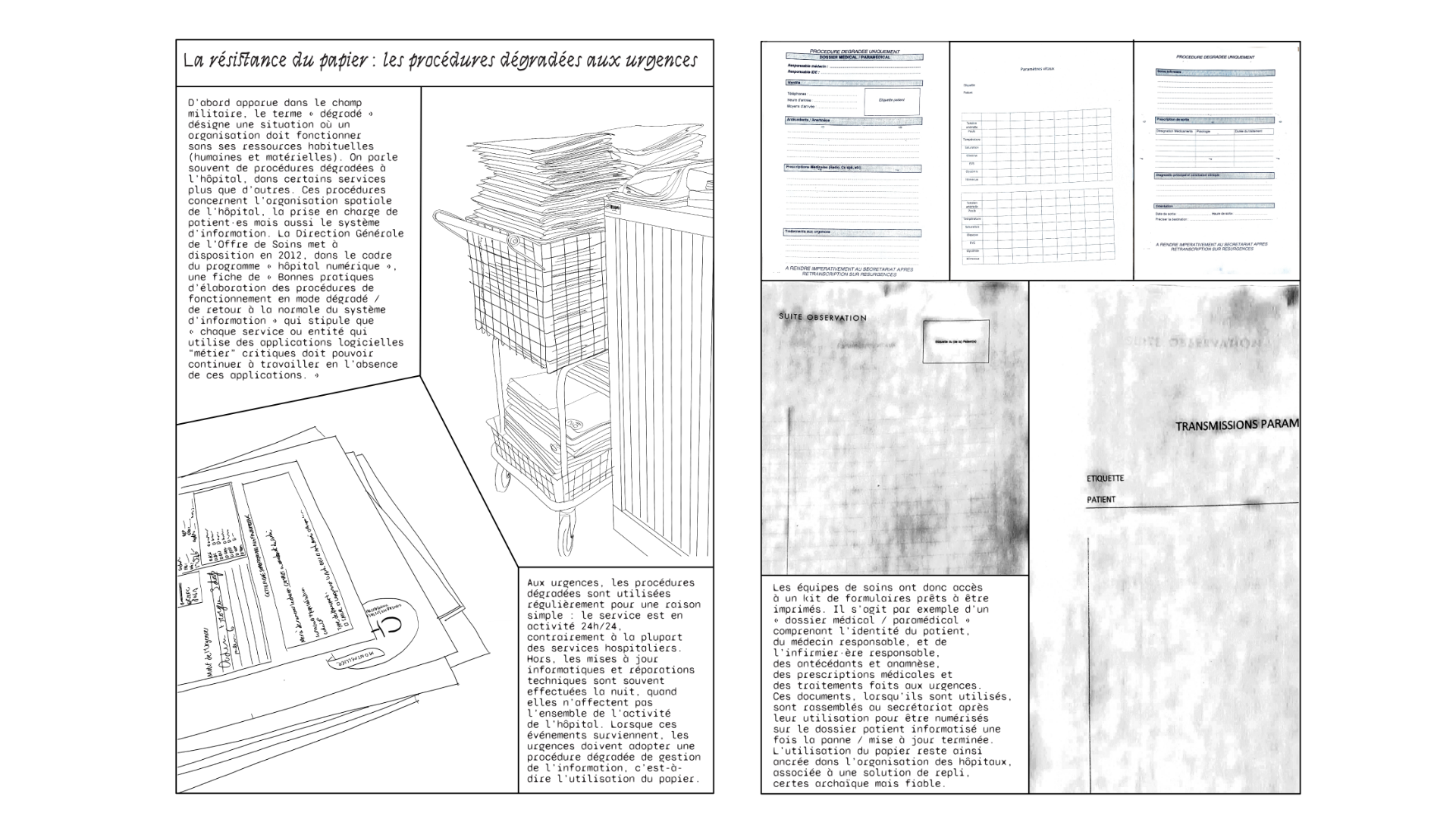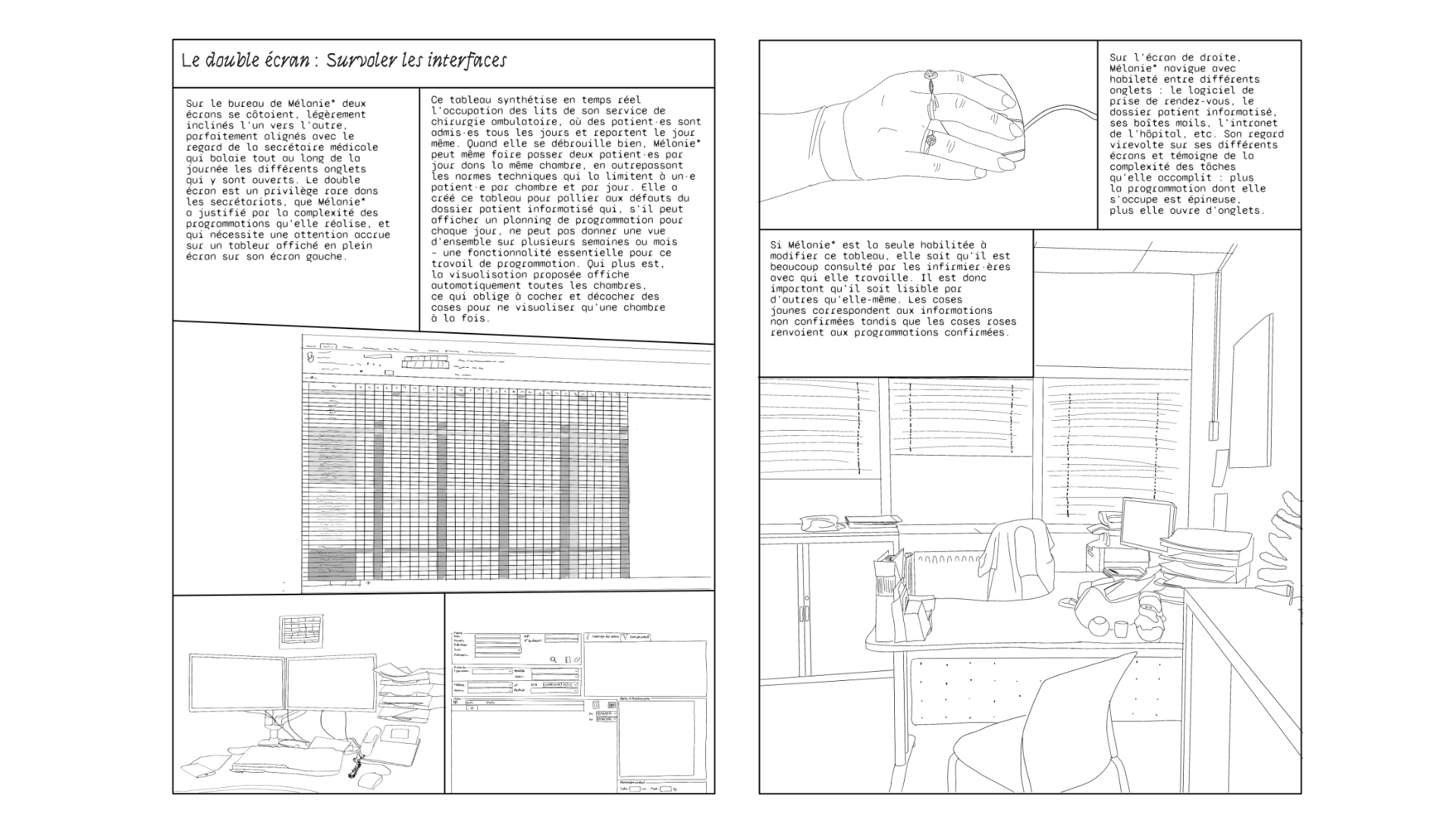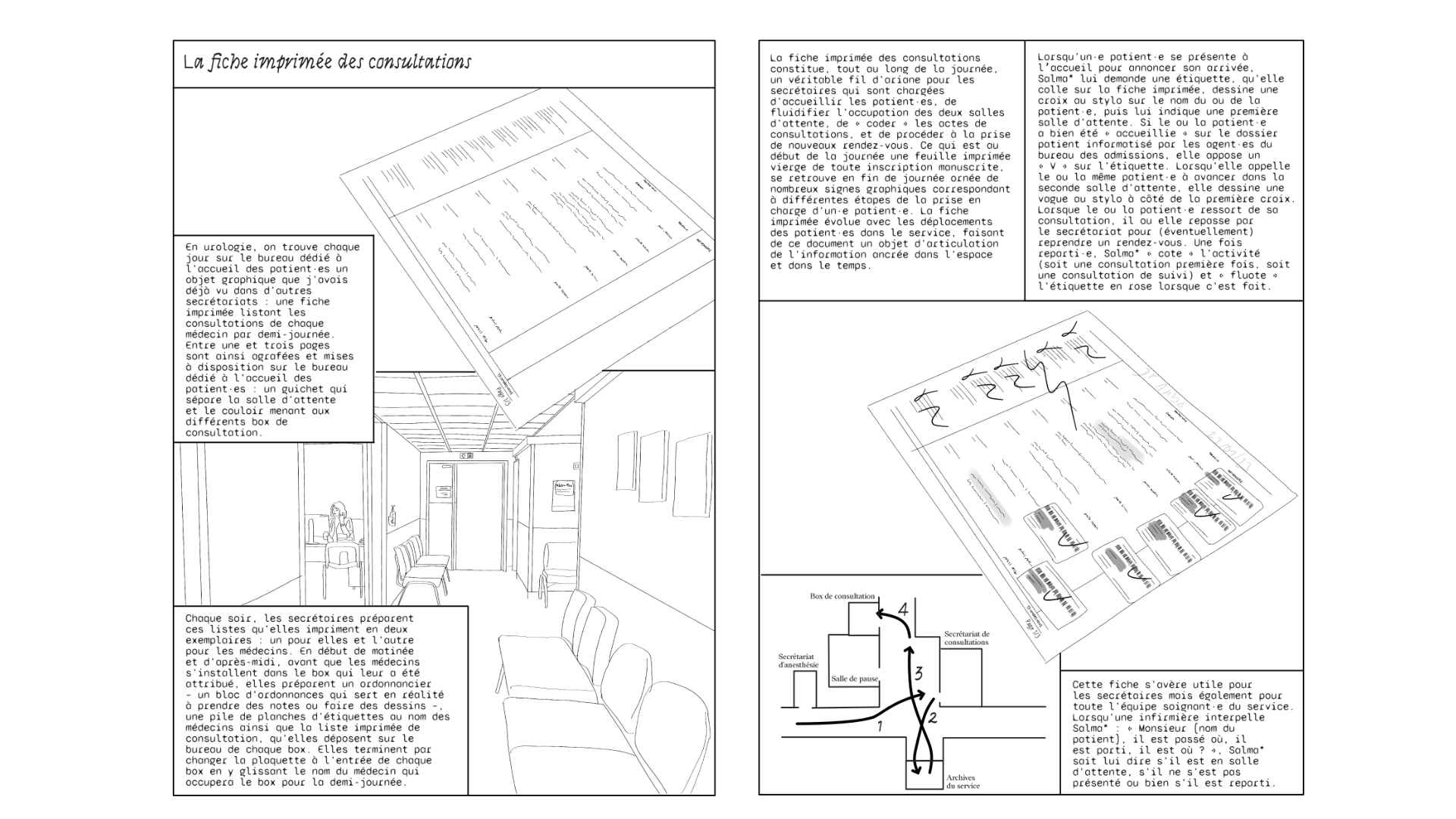 Dans un secrétariat médical, les bureaux, les écrans, les classeurs, les corbeilles et les tiroirs sont peuplés de documents, de notes, de listes, de post-it, de rappels griffonnés, de dossiers en attente. À ces choses s’ajoutent les passages incessants de patient·es, de soignant·es, de cadres, de livreurs ou de technicien·nes. C’est à partir de cette densité matérielle et relationnelle que ce chapitre propose de penser le secrétariat médical comme un espace d’accumulation de traces et d’inscriptions. Ces traces donnent forme à un travail de traduction de l’information hospitalière qui se joue à la frontière de plusieurs infrastructures, en particulier le système d’information hospitalier et le dossier patient. La notion de lisière permet alors de saisir le secrétariat comme un point de contact où s’enchevêtrent des infrastructures médicales, administratives, juridiques et financières. À rebours du récit dominant de l’interopérabilité, souvent présenté comme un horizon d’alignement technique et de fluidité, le chapitre propose des outils conceptuels et graphiques pour rendre visible la matérialité fragmentée, hétérogène et souvent bricolée des infrastructures hospitalières, telle qu’elle se donne à voir depuis le secrétariat.