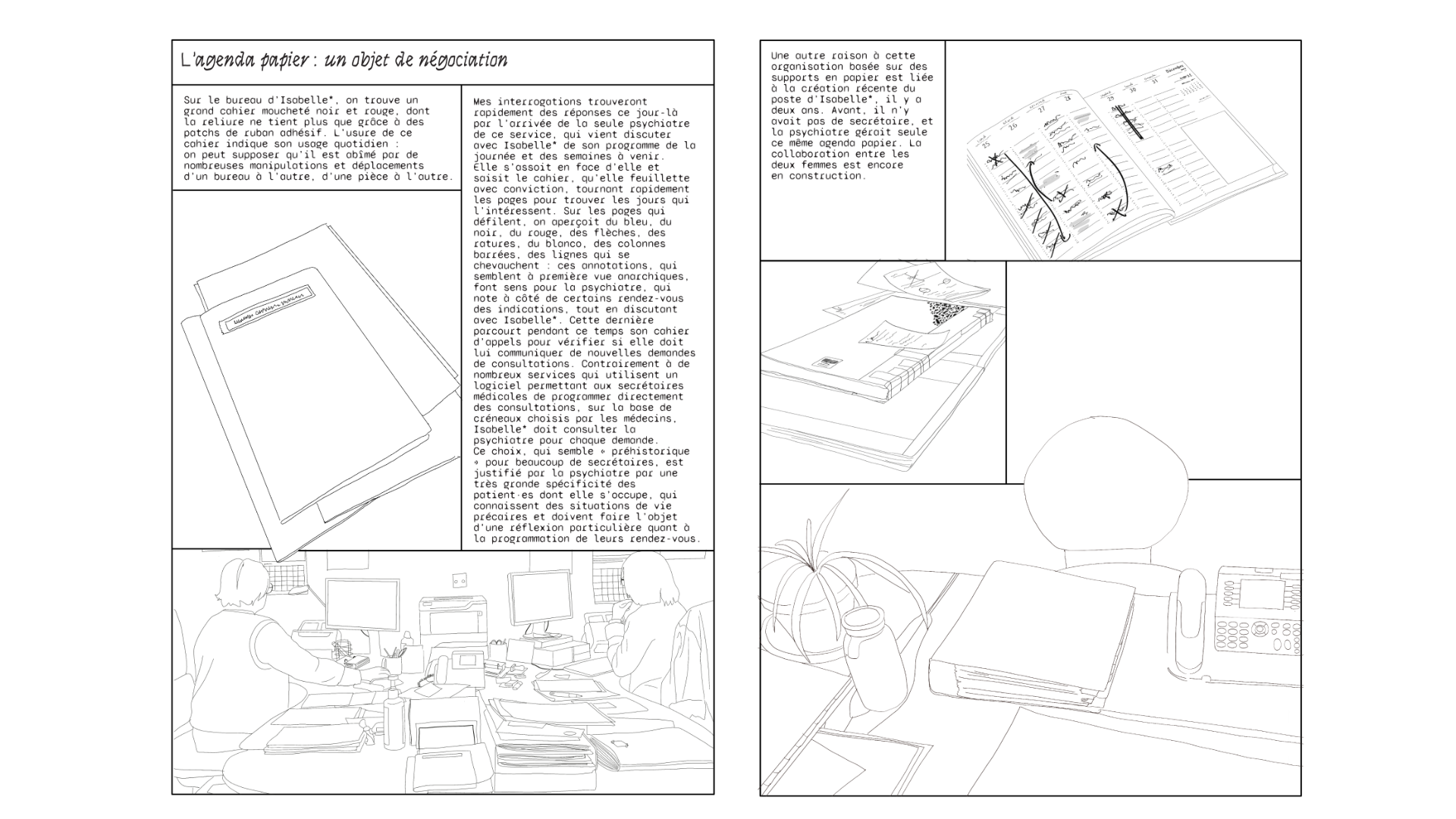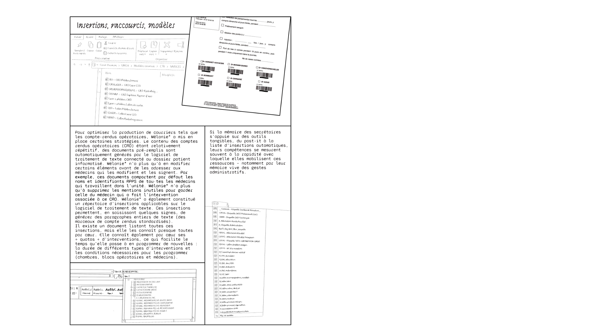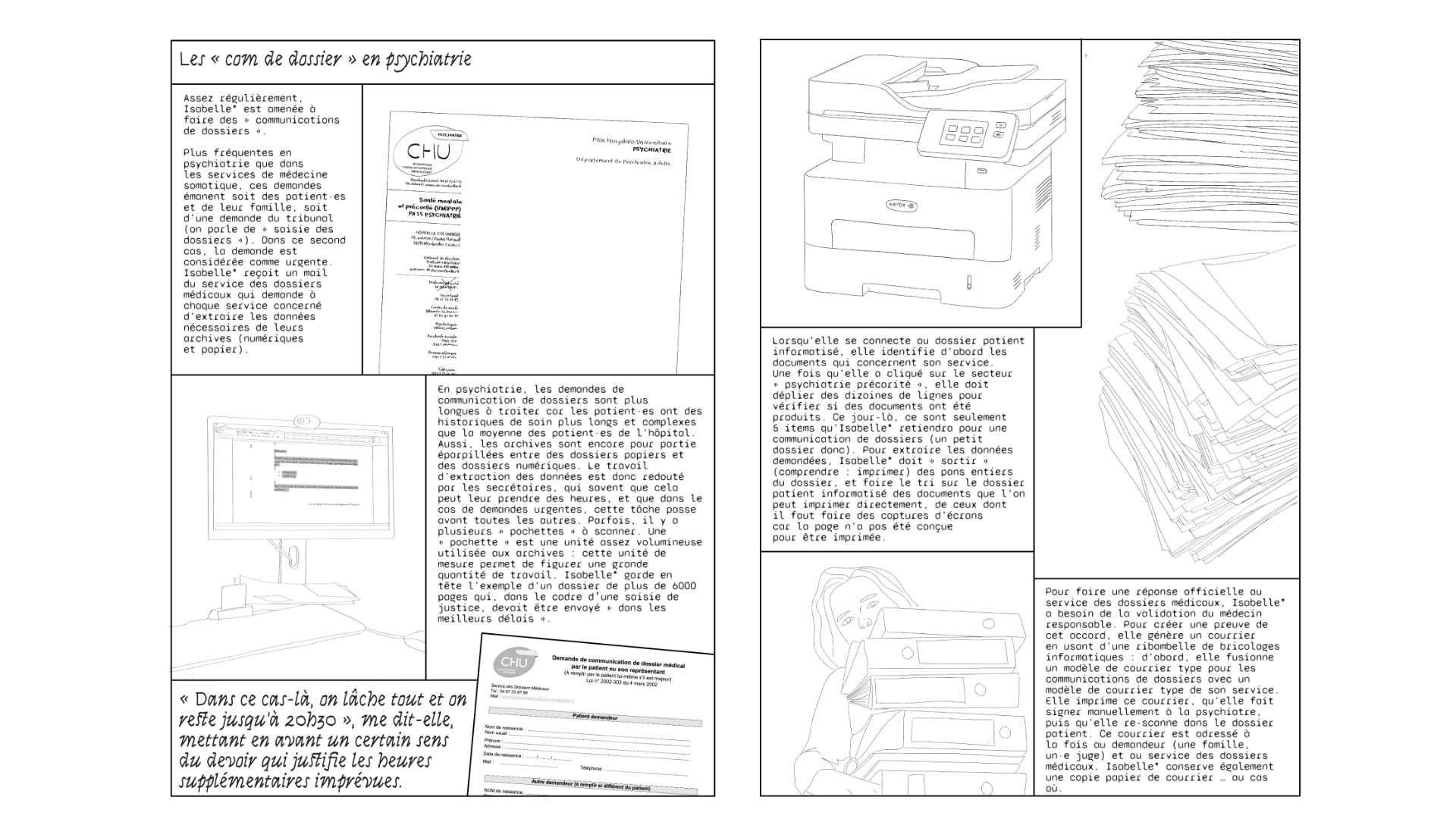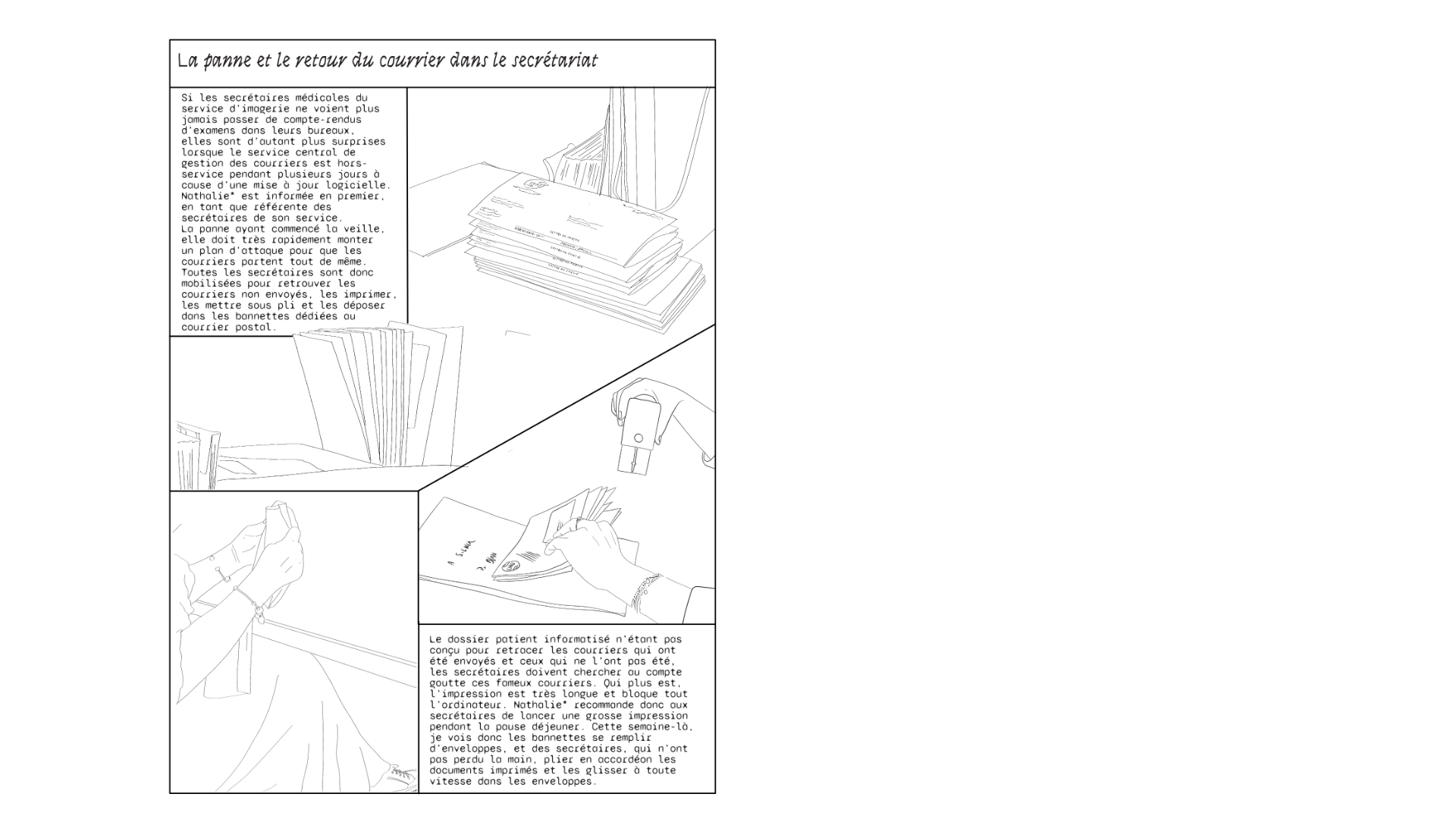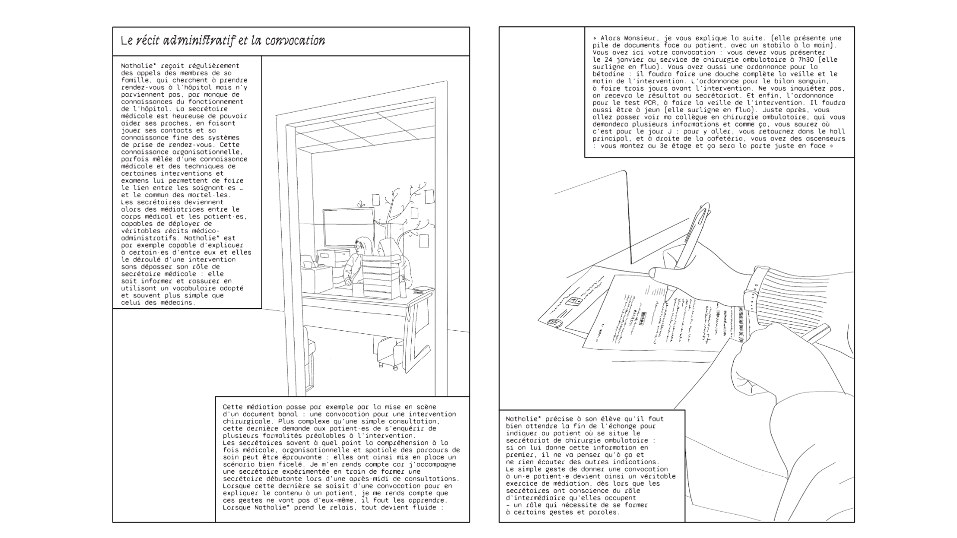 Dans un secrétariat médical, les bureaux, les écrans, les classeurs, les corbeilles et les tiroirs sont peuplés de documents, de notes, de listes, de post-it, de rappels griffonnés, de dossiers en attente. À ces choses s’ajoutent les passages incessants de patient·es, de soignant·es, de cadres, de livreurs ou de technicien·nes. C’est à partir de cette densité matérielle et relationnelle que ce chapitre propose de penser le secrétariat médical comme un espace d’accumulation de traces et d’inscriptions. Ces traces donnent forme à un travail de traduction de l’information hospitalière qui se joue à la frontière de plusieurs infrastructures, en particulier le système d’information hospitalier et le dossier patient. La notion de lisière permet alors de saisir le secrétariat comme un point de contact où s’enchevêtrent des infrastructures médicales, administratives, juridiques et financières. À rebours du récit dominant de l’interopérabilité, souvent présenté comme un horizon d’alignement technique et de fluidité, le chapitre propose des outils conceptuels et graphiques pour rendre visible la matérialité fragmentée, hétérogène et souvent bricolée des infrastructures hospitalières, telle qu’elle se donne à voir depuis le secrétariat.