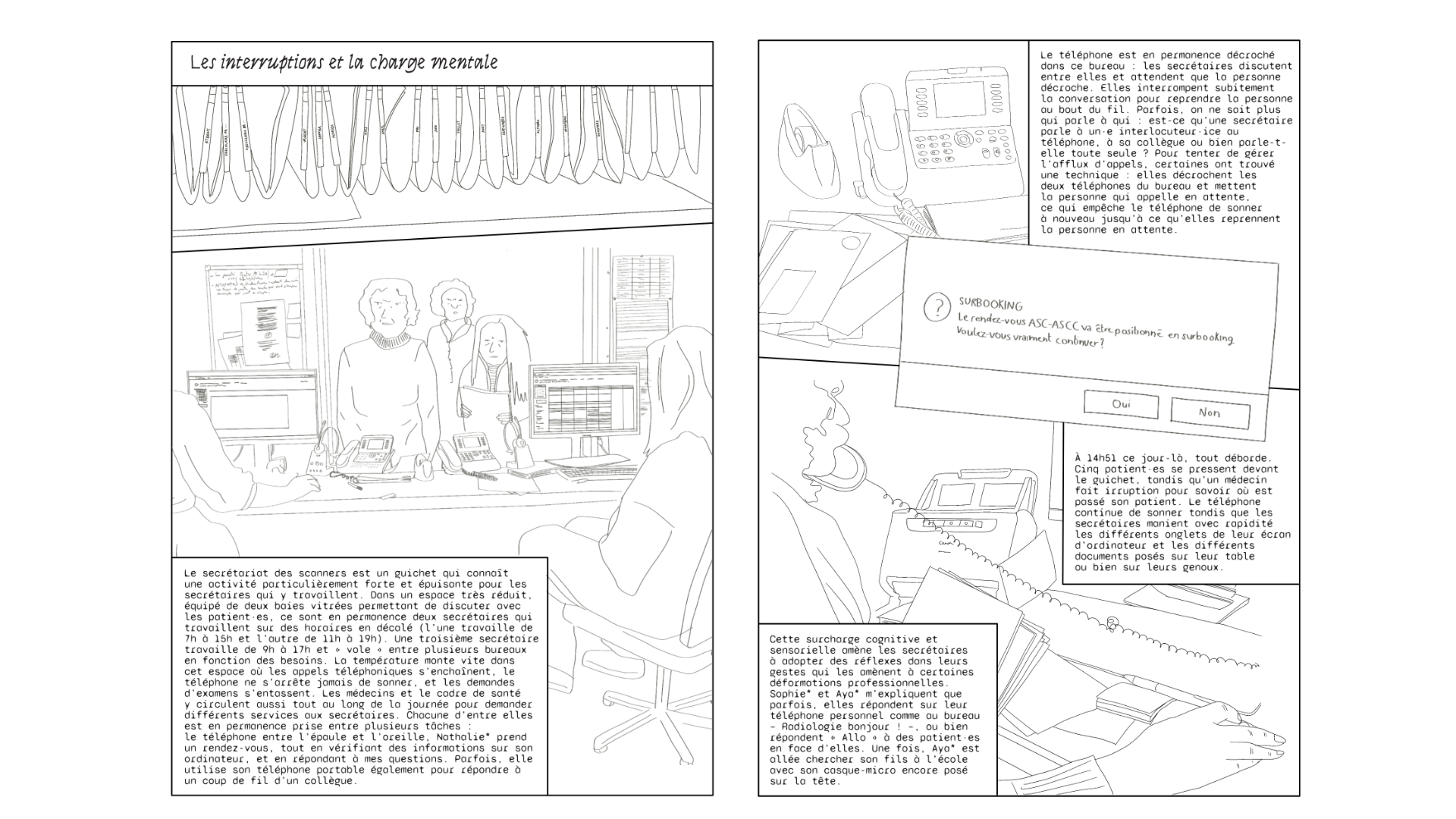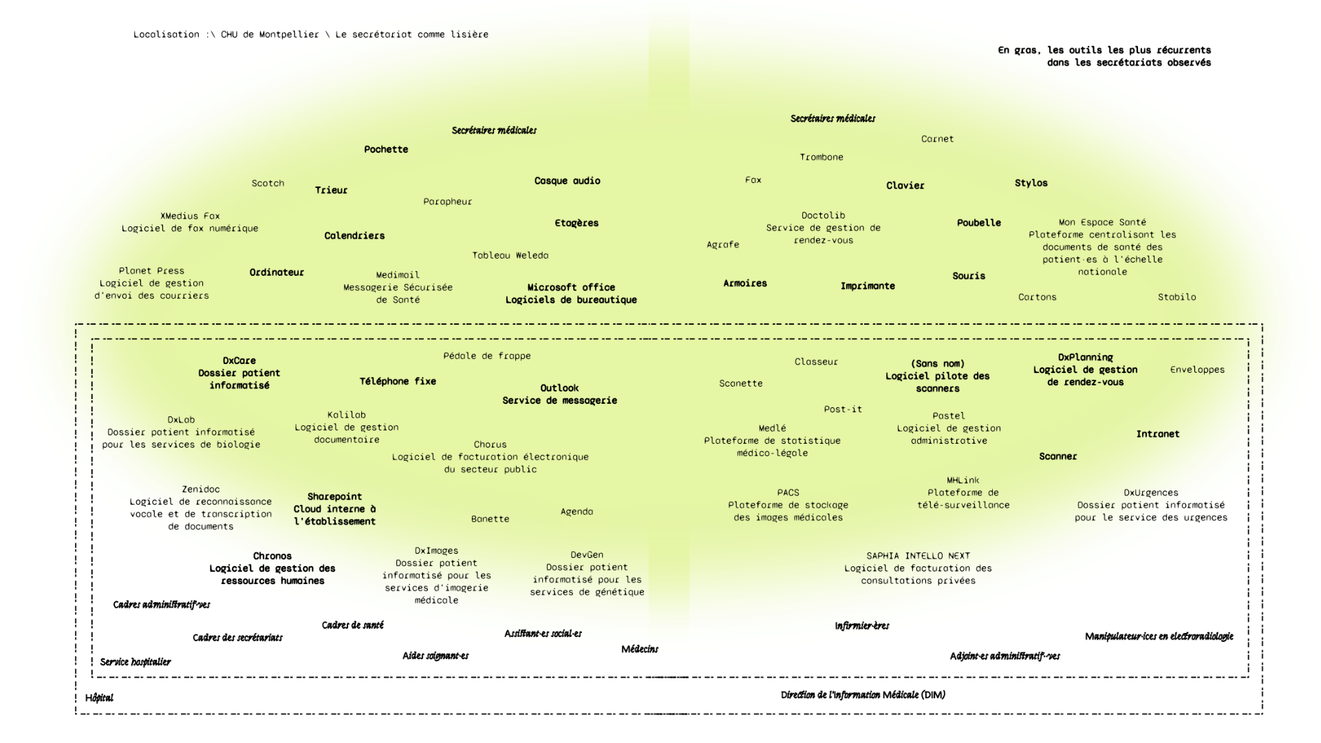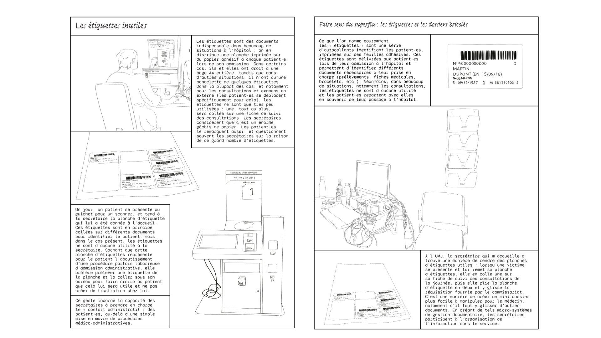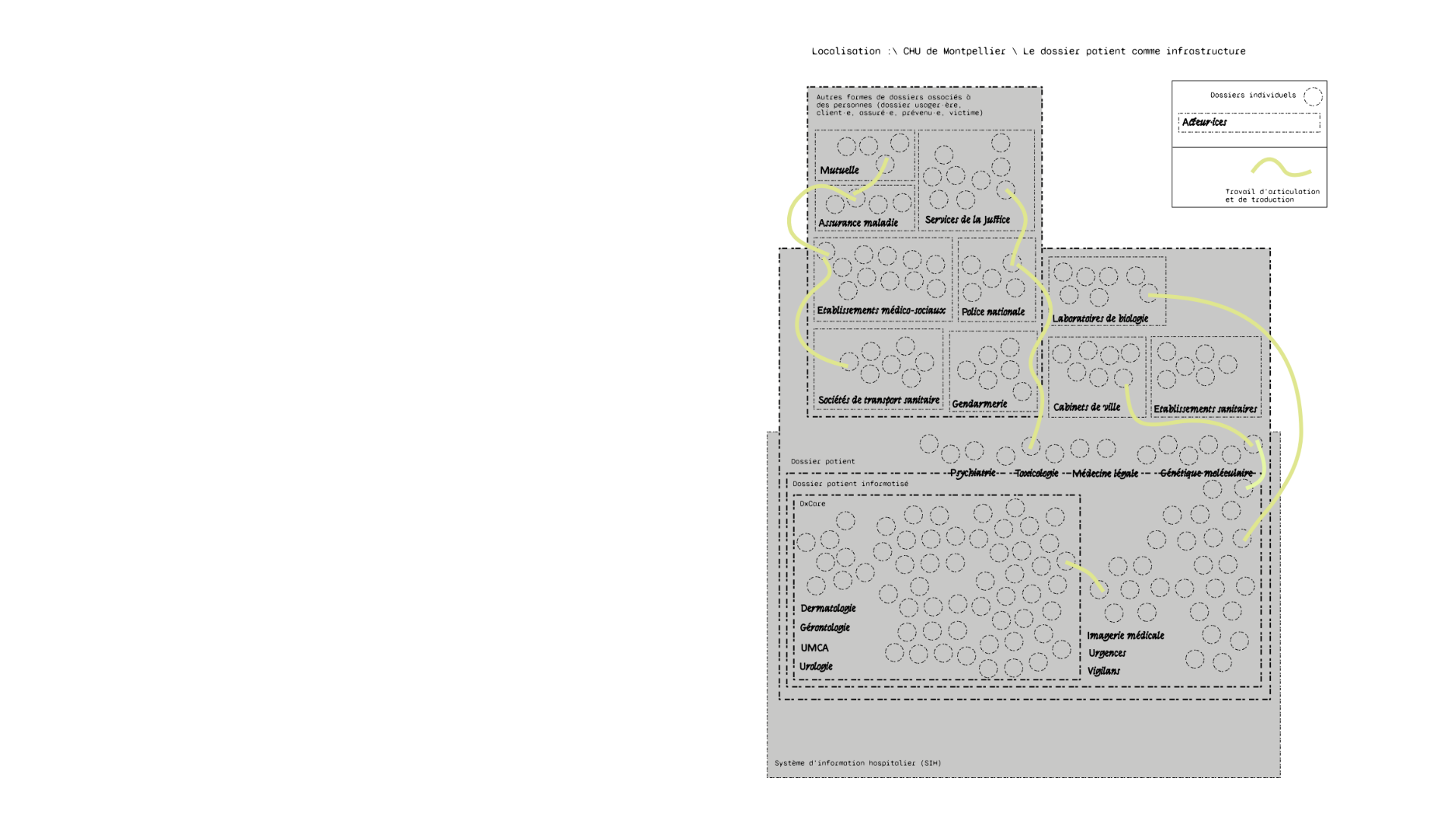 Dans un secrétariat médical, les bureaux, les écrans, les classeurs, les corbeilles et les tiroirs sont peuplés de documents, de notes, de listes, de post-it, de rappels griffonnés, de dossiers en attente. À ces choses s’ajoutent les passages incessants de patient·es, de soignant·es, de cadres, de livreurs ou de technicien·nes. C’est à partir de cette densité matérielle et relationnelle que ce chapitre propose de penser le secrétariat médical comme un espace d’accumulation de traces et d’inscriptions. Ces traces donnent forme à un travail de traduction de l’information hospitalière qui se joue à la frontière de plusieurs infrastructures, en particulier le système d’information hospitalier et le dossier patient. La notion de lisière permet alors de saisir le secrétariat comme un point de contact où s’enchevêtrent des infrastructures médicales, administratives, juridiques et financières. À rebours du récit dominant de l’interopérabilité, souvent présenté comme un horizon d’alignement technique et de fluidité, le chapitre propose des outils conceptuels et graphiques pour rendre visible la matérialité fragmentée, hétérogène et souvent bricolée des infrastructures hospitalières, telle qu’elle se donne à voir depuis le secrétariat.