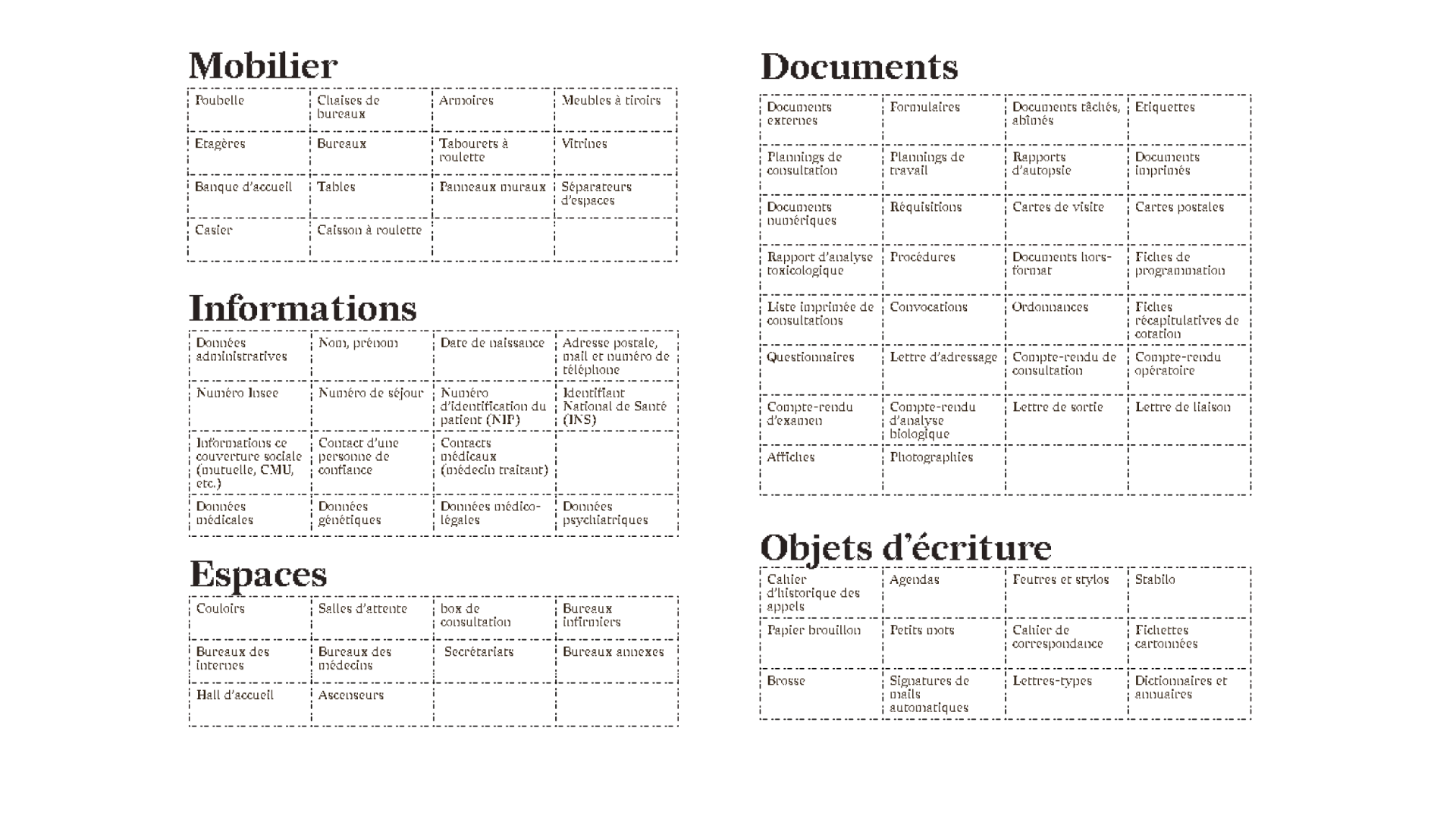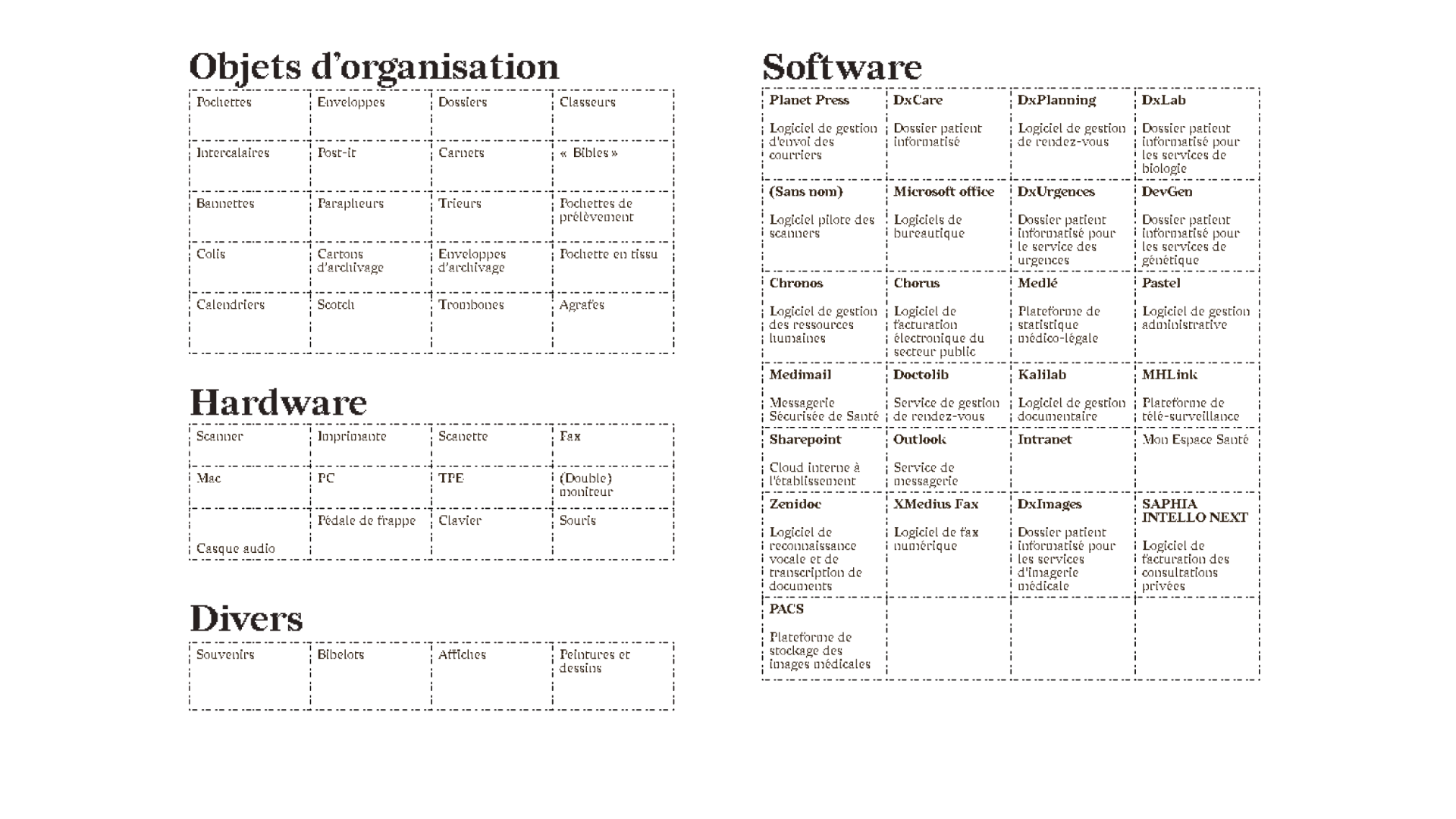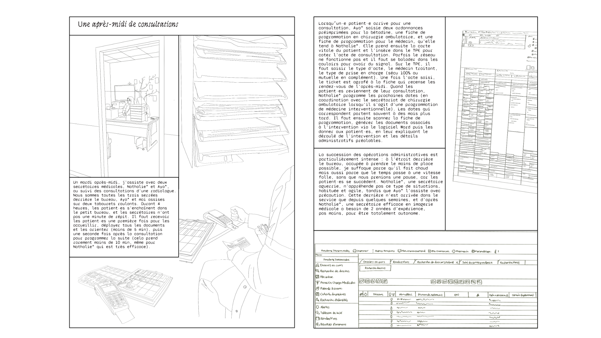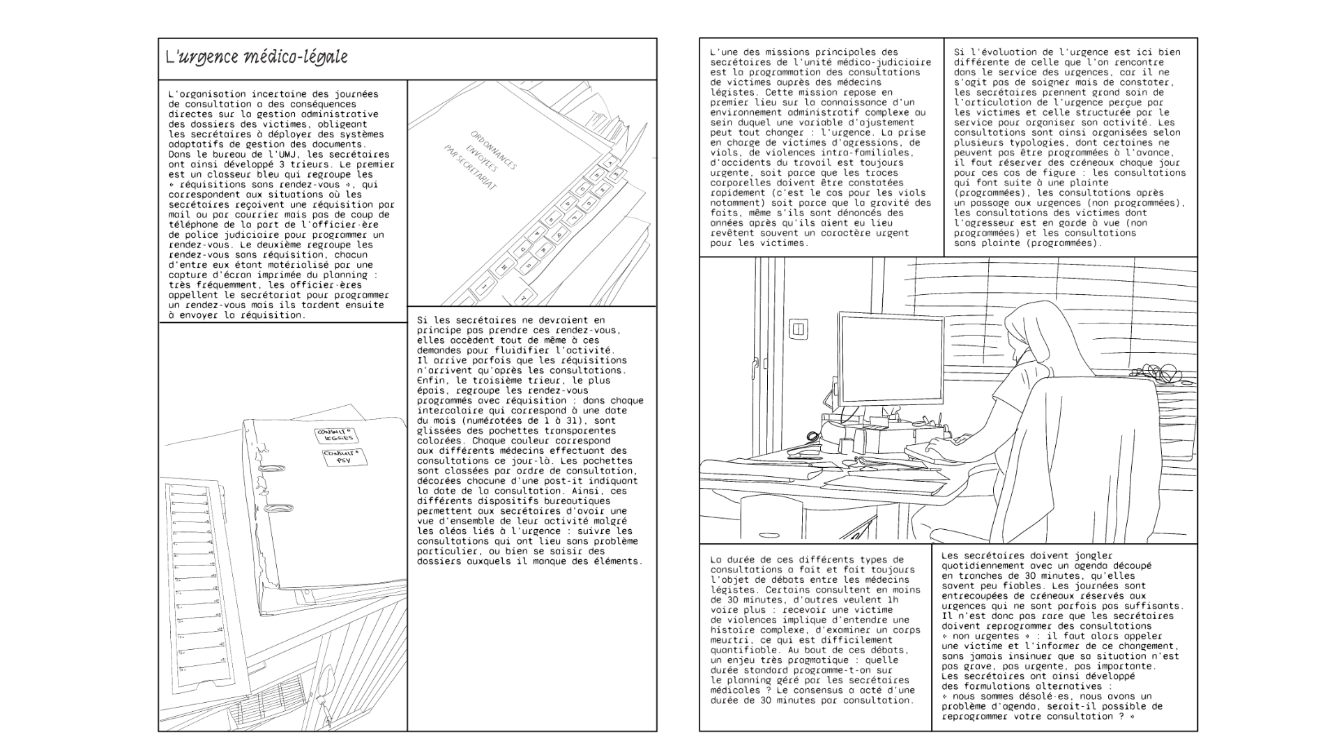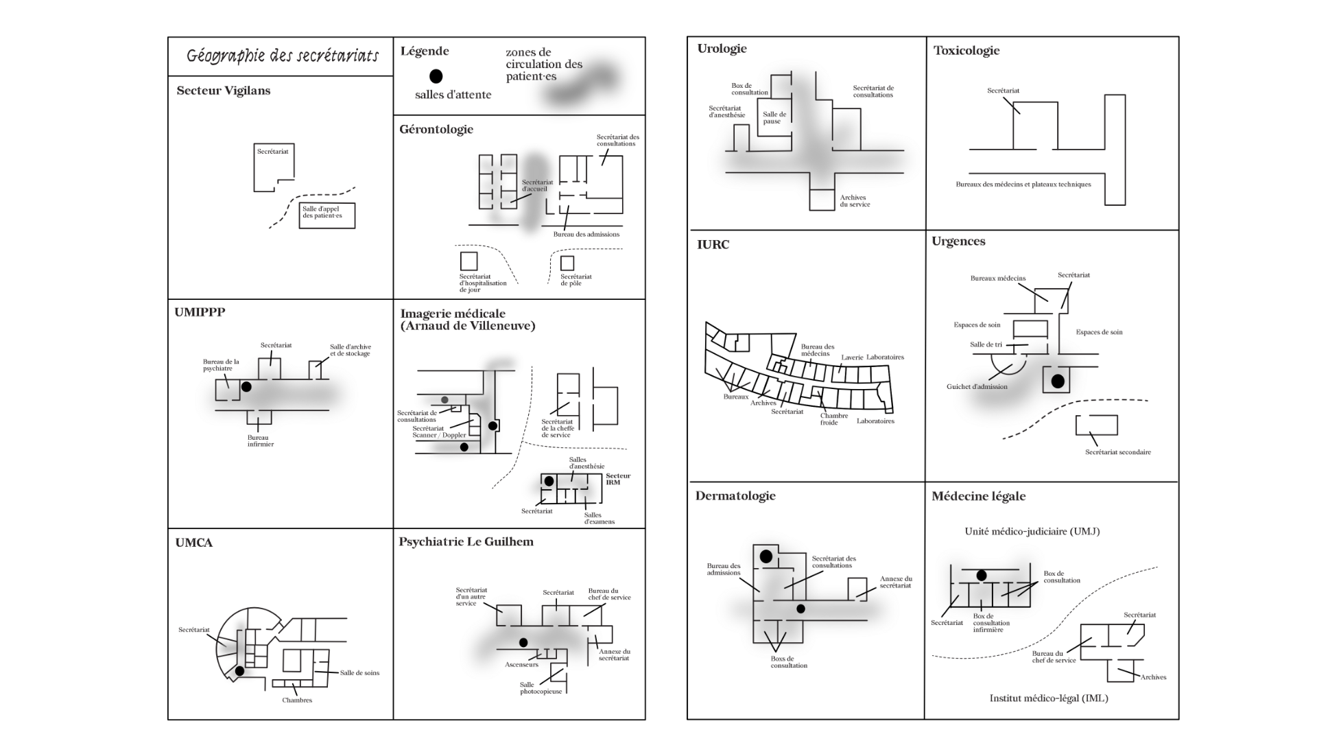 Dans un secrétariat médical, les bureaux, les écrans, les classeurs, les corbeilles et les tiroirs sont peuplés de documents, de notes, de listes, de post-it, de rappels griffonnés, de dossiers en attente. À ces choses s’ajoutent les passages incessants de patient·es, de soignant·es, de cadres, de livreurs ou de technicien·nes. C’est à partir de cette densité matérielle et relationnelle que ce chapitre propose de penser le secrétariat médical comme un espace d’accumulation de traces et d’inscriptions. Ces traces donnent forme à un travail de traduction de l’information hospitalière qui se joue à la frontière de plusieurs infrastructures, en particulier le système d’information hospitalier et le dossier patient. La notion de lisière permet alors de saisir le secrétariat comme un point de contact où s’enchevêtrent des infrastructures médicales, administratives, juridiques et financières. À rebours du récit dominant de l’interopérabilité, souvent présenté comme un horizon d’alignement technique et de fluidité, le chapitre propose des outils conceptuels et graphiques pour rendre visible la matérialité fragmentée, hétérogène et souvent bricolée des infrastructures hospitalières, telle qu’elle se donne à voir depuis le secrétariat.