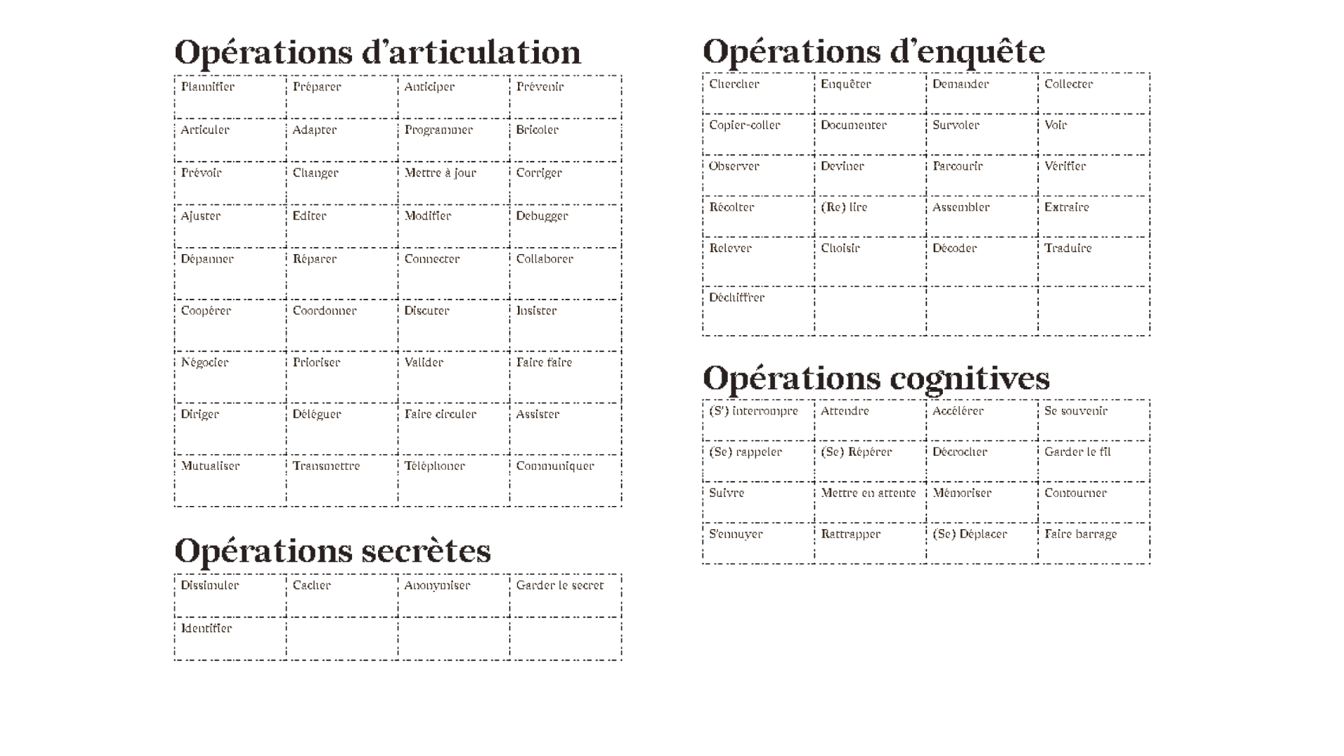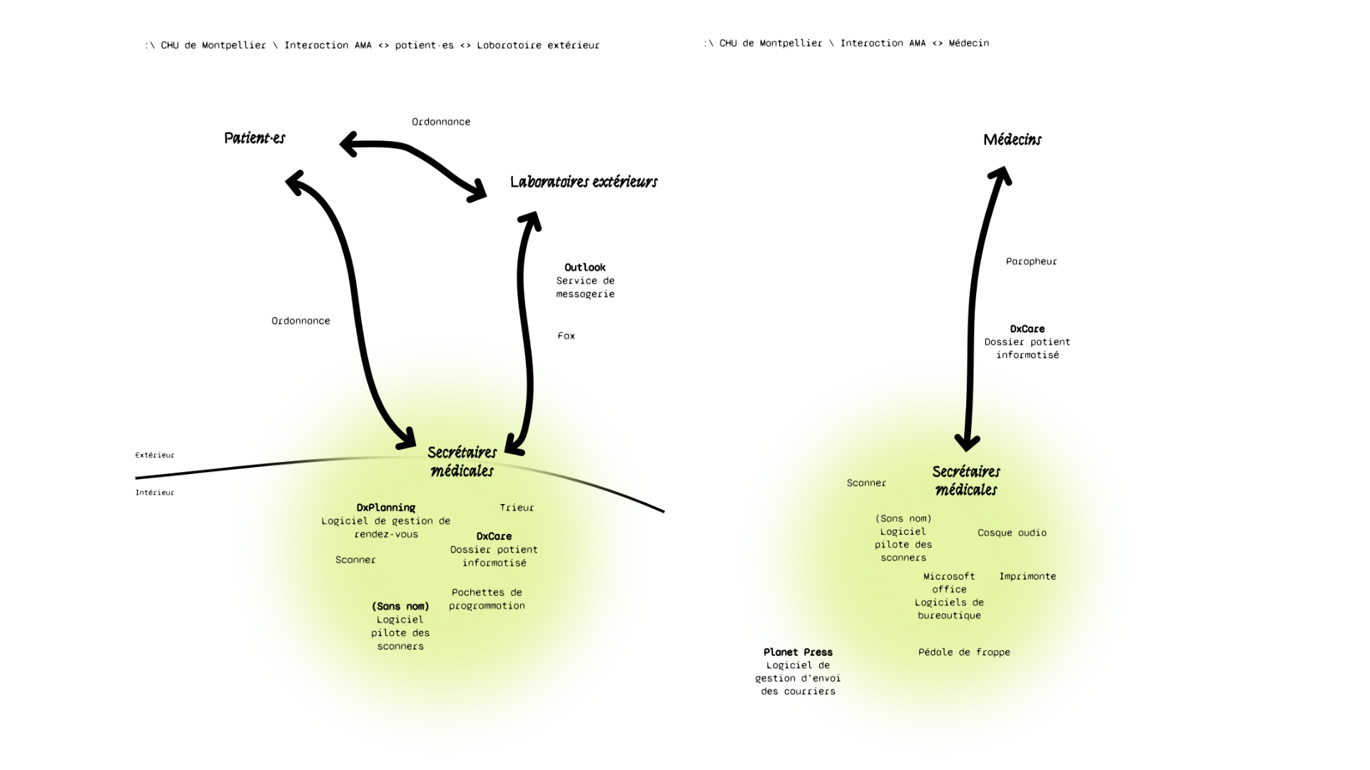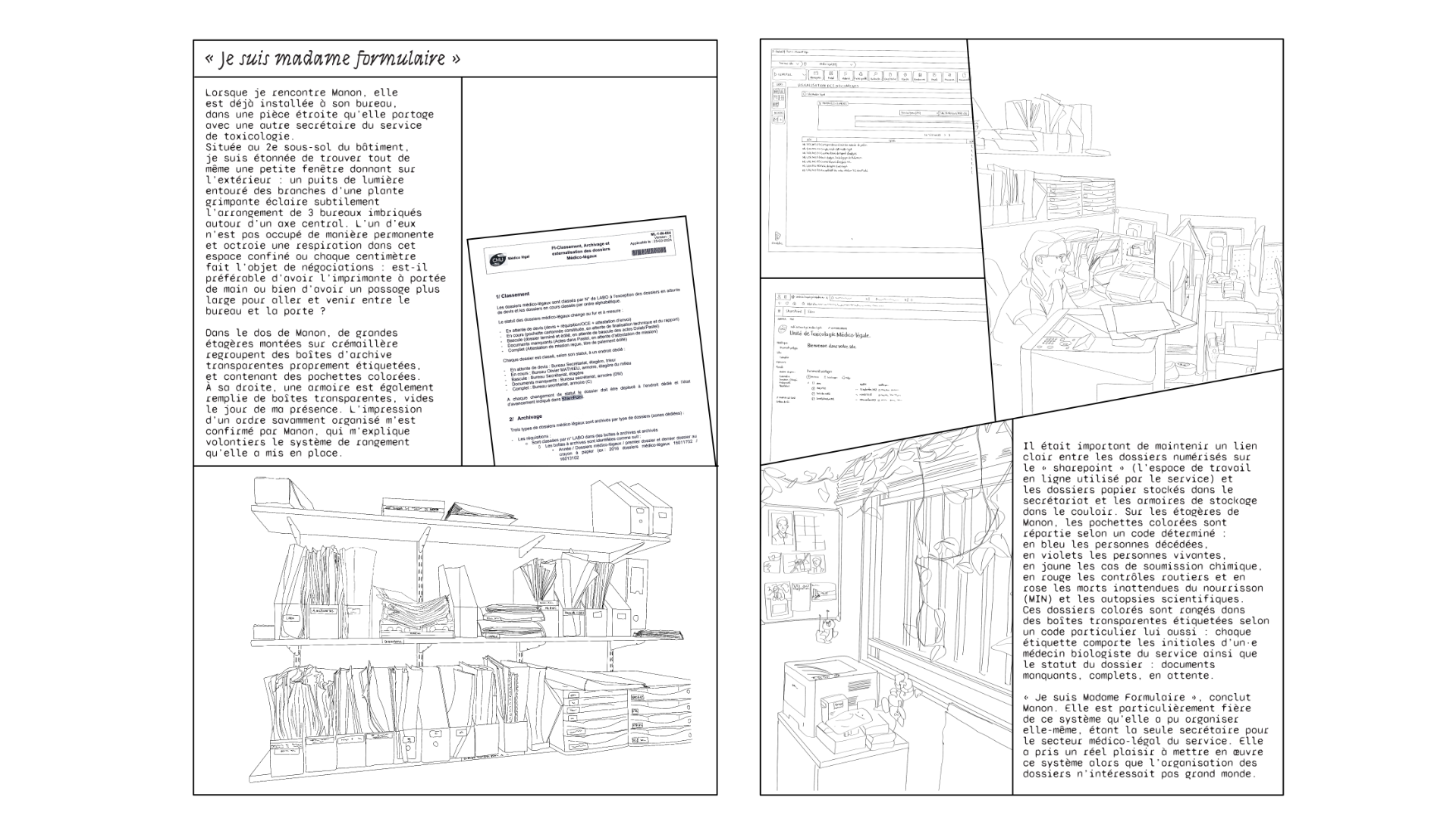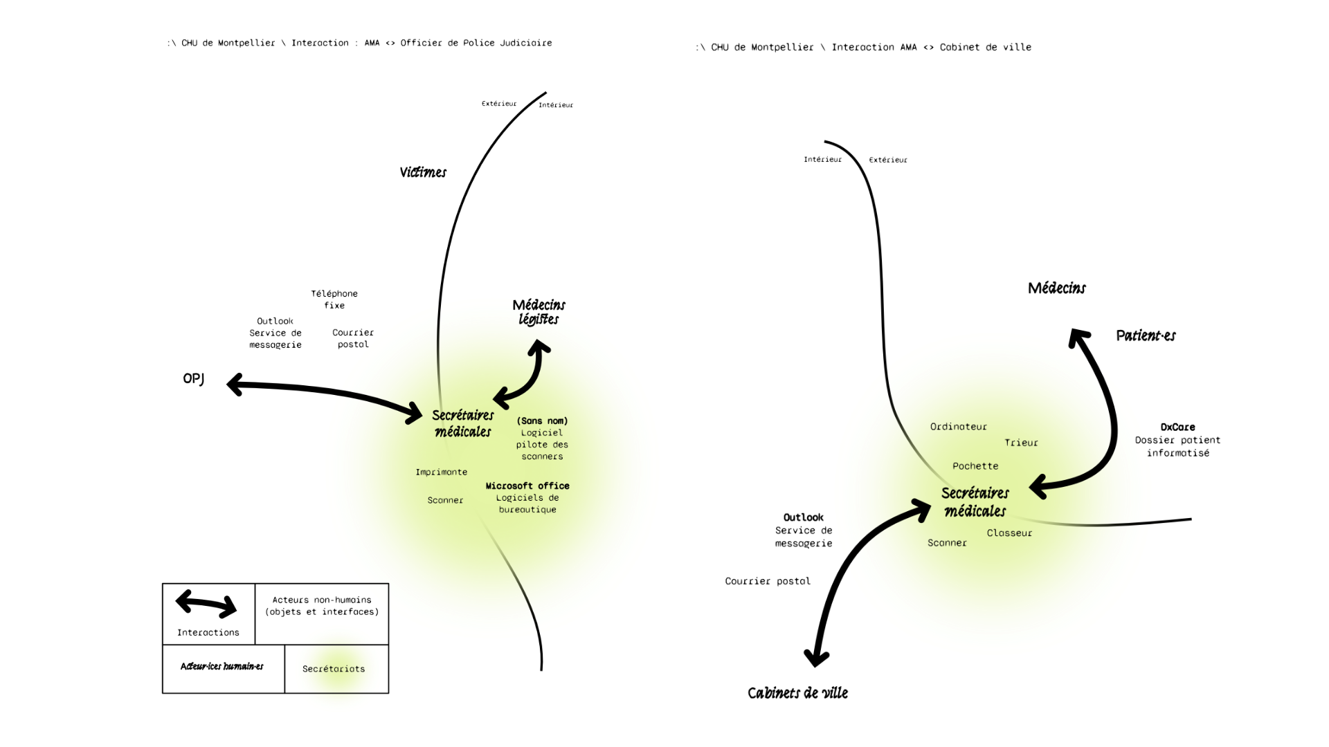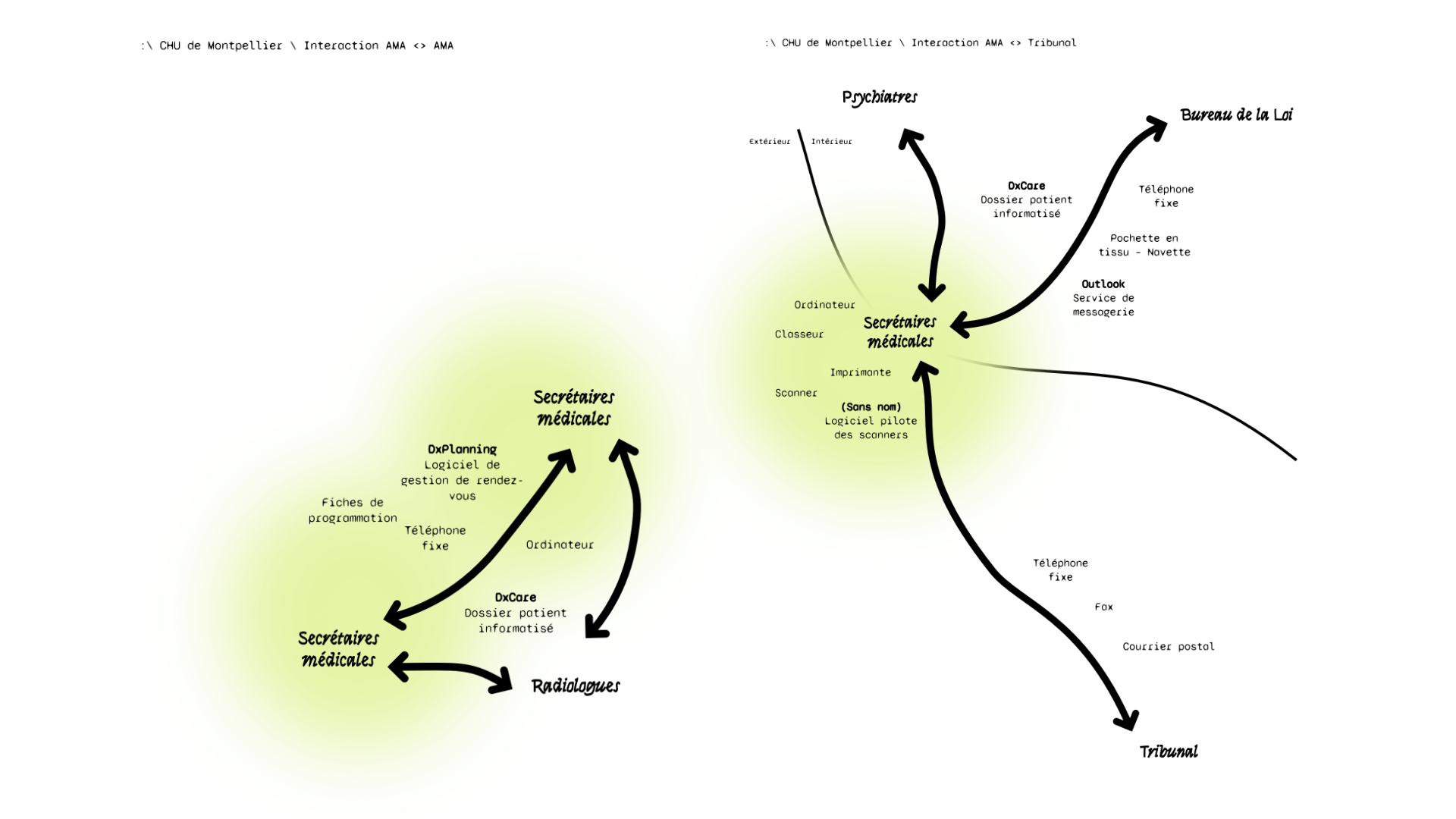 Dans un secrétariat médical, les bureaux, les écrans, les classeurs, les corbeilles et les tiroirs sont peuplés de documents, de notes, de listes, de post-it, de rappels griffonnés, de dossiers en attente. À ces choses s’ajoutent les passages incessants de patient·es, de soignant·es, de cadres, de livreurs ou de technicien·nes. C’est à partir de cette densité matérielle et relationnelle que ce chapitre propose de penser le secrétariat médical comme un espace d’accumulation de traces et d’inscriptions. Ces traces donnent forme à un travail de traduction de l’information hospitalière qui se joue à la frontière de plusieurs infrastructures, en particulier le système d’information hospitalier et le dossier patient. La notion de lisière permet alors de saisir le secrétariat comme un point de contact où s’enchevêtrent des infrastructures médicales, administratives, juridiques et financières. À rebours du récit dominant de l’interopérabilité, souvent présenté comme un horizon d’alignement technique et de fluidité, le chapitre propose des outils conceptuels et graphiques pour rendre visible la matérialité fragmentée, hétérogène et souvent bricolée des infrastructures hospitalières, telle qu’elle se donne à voir depuis le secrétariat.