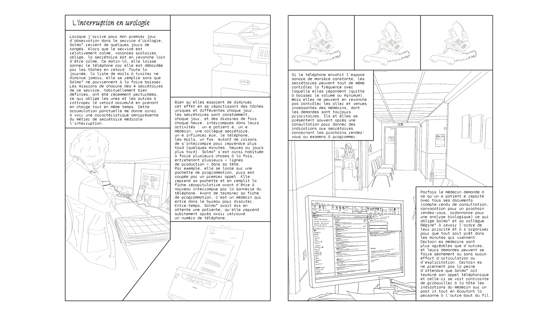Les secrétaires ont souvent et longtemps été qualifiées de « seconde épouse » par leurs patrons pour leurs qualités qui s’inscrivent dans le prolongement de ceux de leur première épouse. Si cette expression n’a pas perduré en tant que telle, le continuum existant entre le travail domestique et le travail salarié des secrétaires (médicales) perdure. Ce chapitre s’emploie ainsi à décrire lesinterruptions, et la charge mentale qui y est associée, dans le travail des secrétaires médicales : appels, passages de patient·es, sollicitations des médecins ou arrivées de documents fragmentent sans cesse le travail. En décrivant ces micro-événements, le chapitre montre comment les secrétaires développent une compétence de disponibilité organisée, consistant à maintenir la continuité dans la discontinuité. Ce régime attentionnel, souvent naturalisé comme féminin, fait écho aux logiques domestiques : soin des autres, anticipation, maintien d’un ordre invisible. Du foyer au bureau, les secrétaires développent ainsi une cognition distribuée qui s’appuie sur une variété de choses qui peuplent l’espace du secrétariat. La culture de l’interruption qui caractérise le métier de secrétaire médicale est enfin à comprendre d’un point de vue spatial : tantôt isolé ou au cœur du soin, le secrétariat cristallise un rapport particulier aux mouvements et déplacements des secrétaires, contraintes à la fois par une obligation de présence à leur bureau mais aussi par des déplacements journaliers d’un bureau à l’autre.