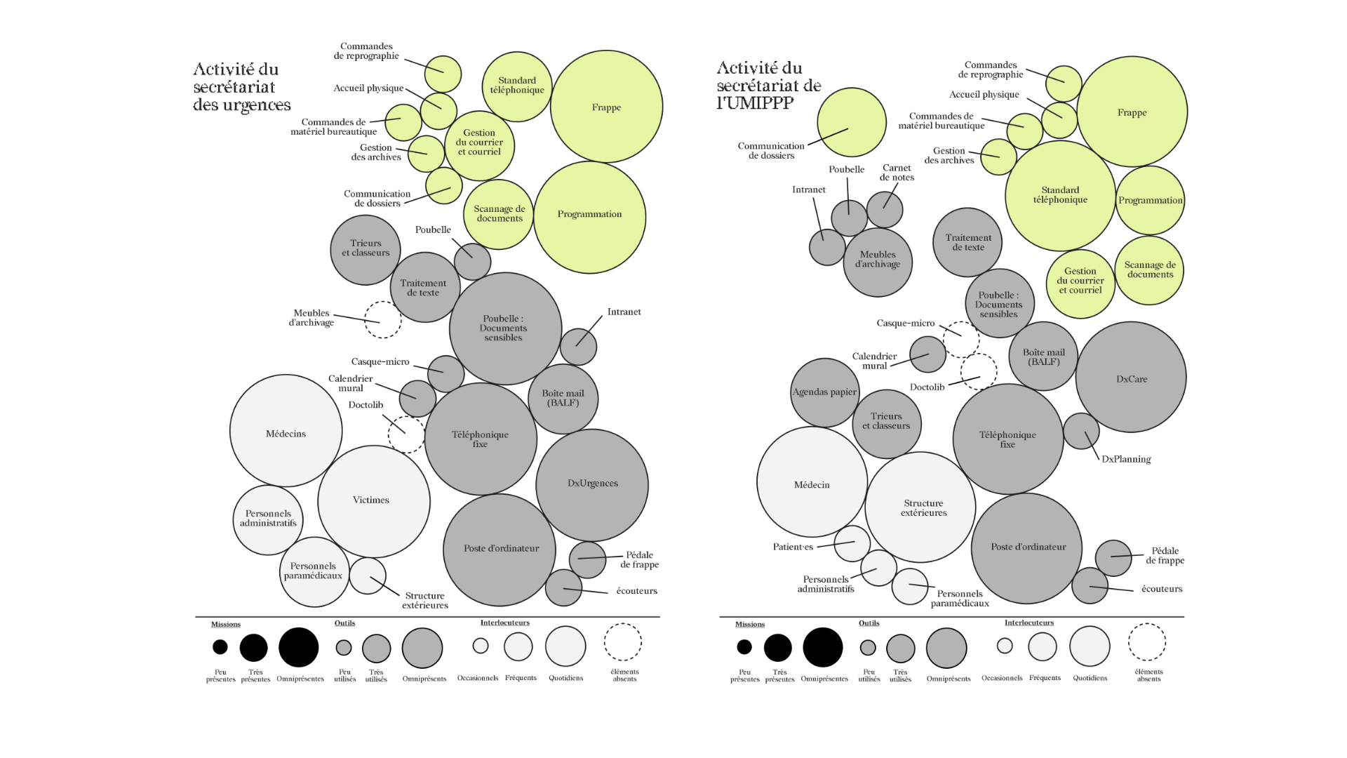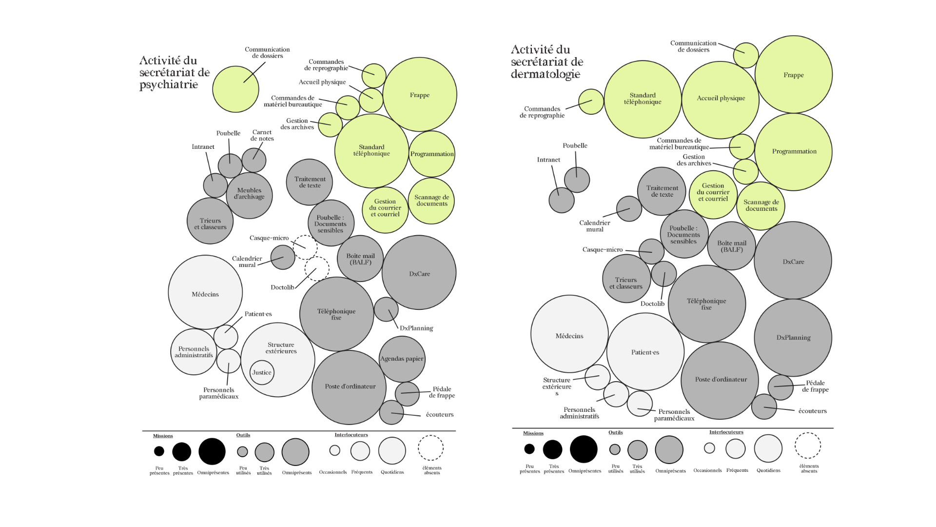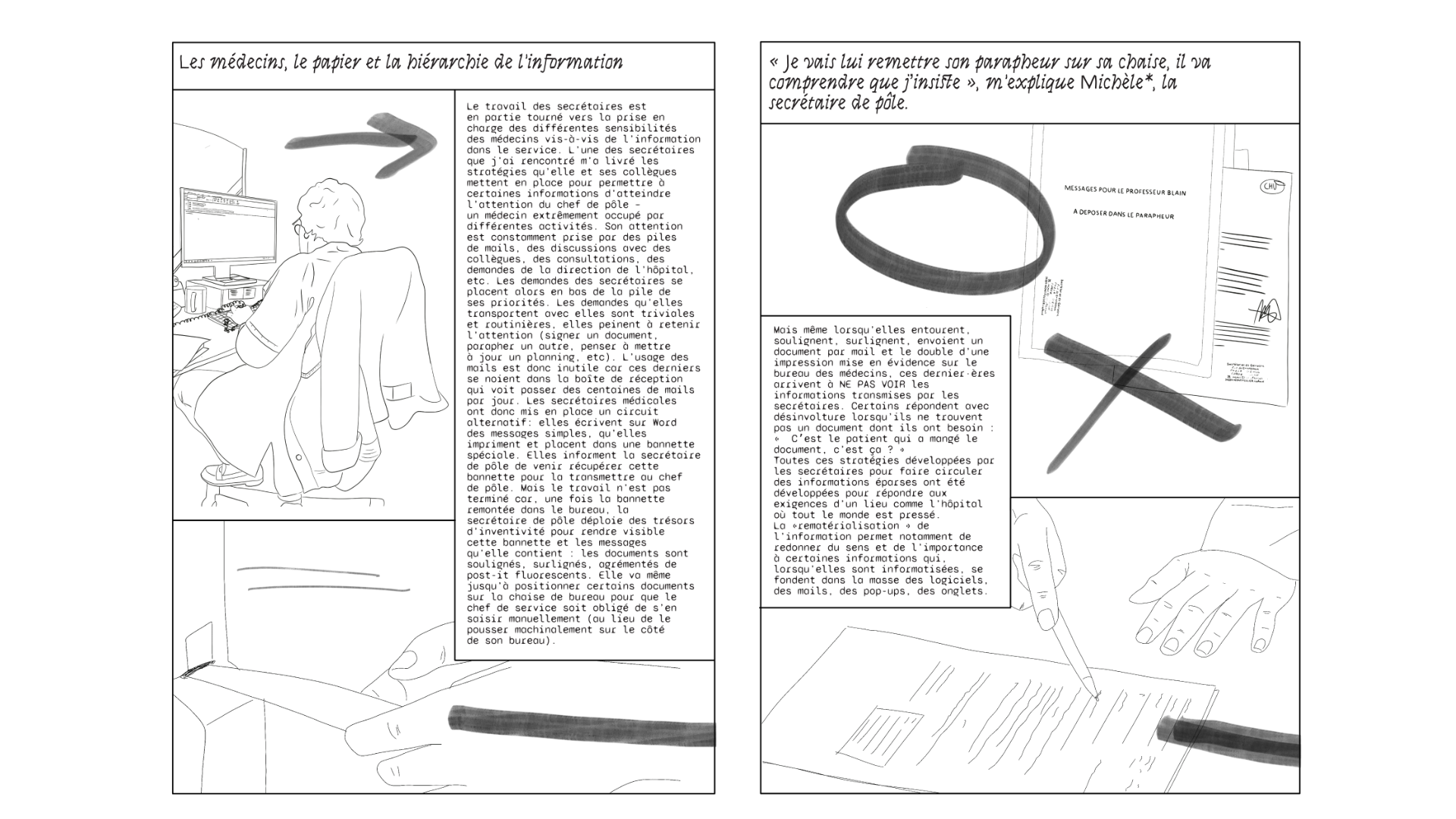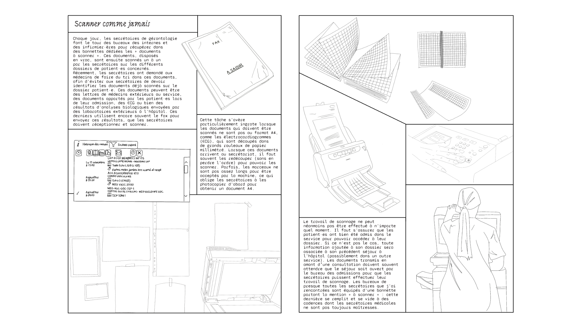 Pourquoi les secrétaires médicales sont-elles encore présentes dans les hôpitaux alors que la disparition de leur métier est annoncée depuis plusieurs décennies par une succession de discours prônant la dématérialisation de l’information ? Cette thèse propose de répondre à cette question au travers d’un contre-récit des infrastructures décrivant les conditions matérielles du travail médico-administratif des secrétaires médicales : un travail essentiel mais largement ignoré. À la lisière des infrastructures de l’information, les secrétaires médicales réalisent un ensemble d’opérations de traduction – agencer, copier, articuler, programmer, faire propre, prendre soin, etc. – qui participent à faire tenir l’hôpital et l’activité de soin qui s’y déroule. En montrant que cette forme de travail des données repose sur des environnements matériels fragiles et sur une multitude d’objets graphiques, ce travail de recherche décrit un monde où l’information ne circule jamais seule. À partir d’une enquête ethnographique au croisement des Sciences and Technology Studies (STS) et du design graphique, ce travail de recherche propose une analyse inédite du métier de secrétaire médicale, qui contribue à une approche féministe du travail des données, une critique des discours de la dématérialisation dans le champ du numérique en santé, et à l’étude des documents médico-administratifs comme des objets graphiques et politiques.