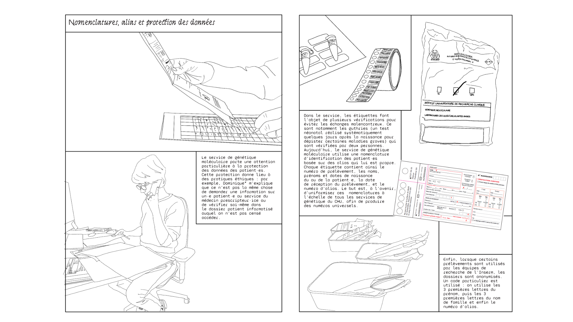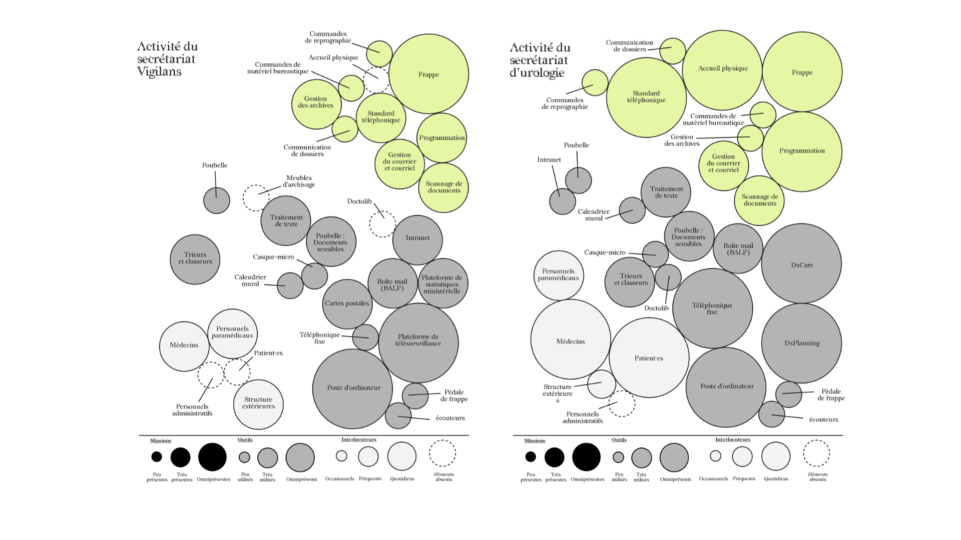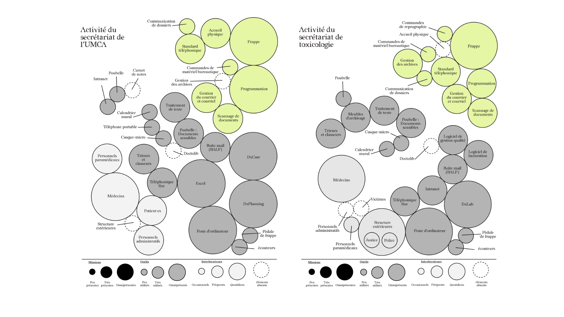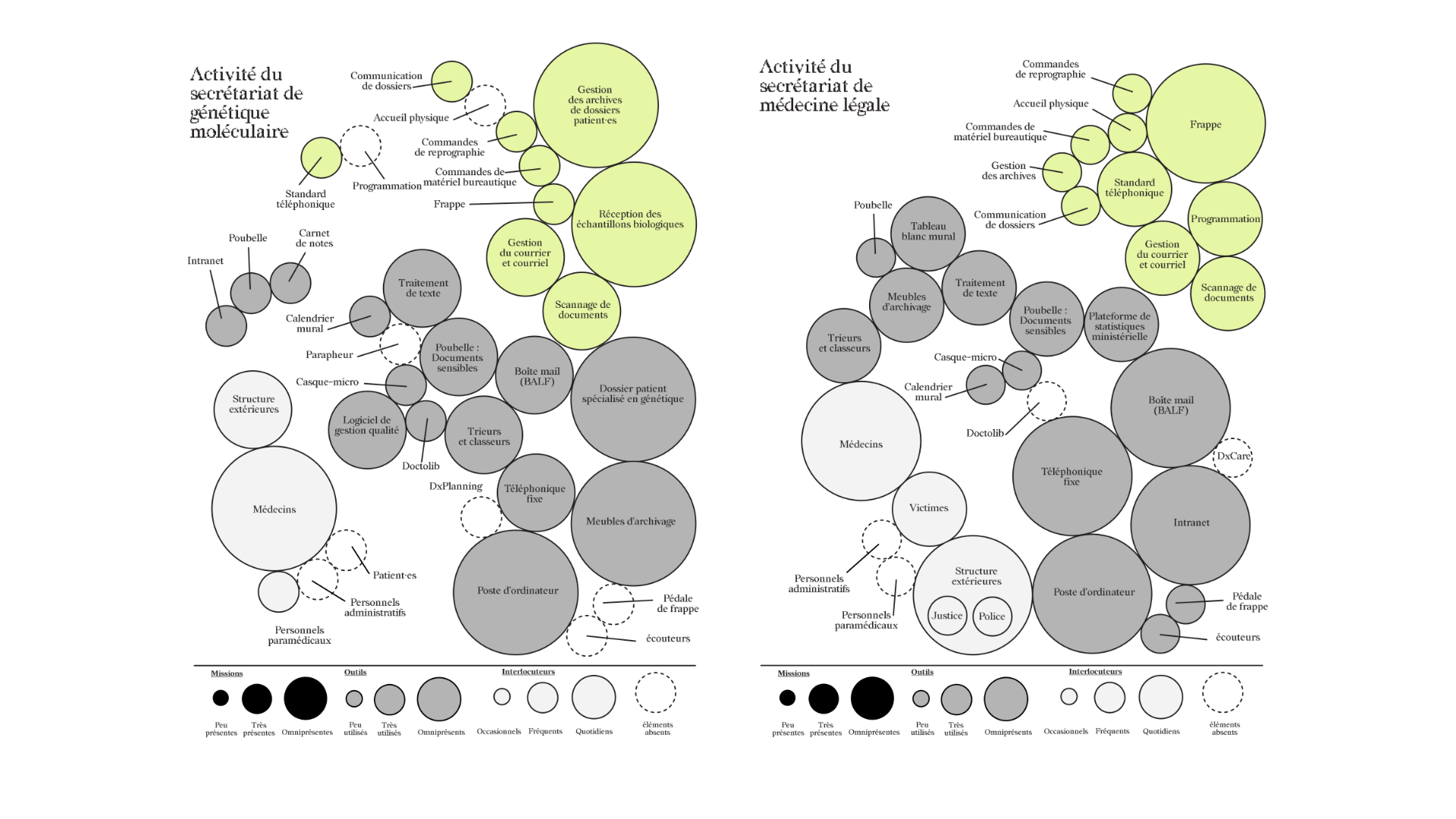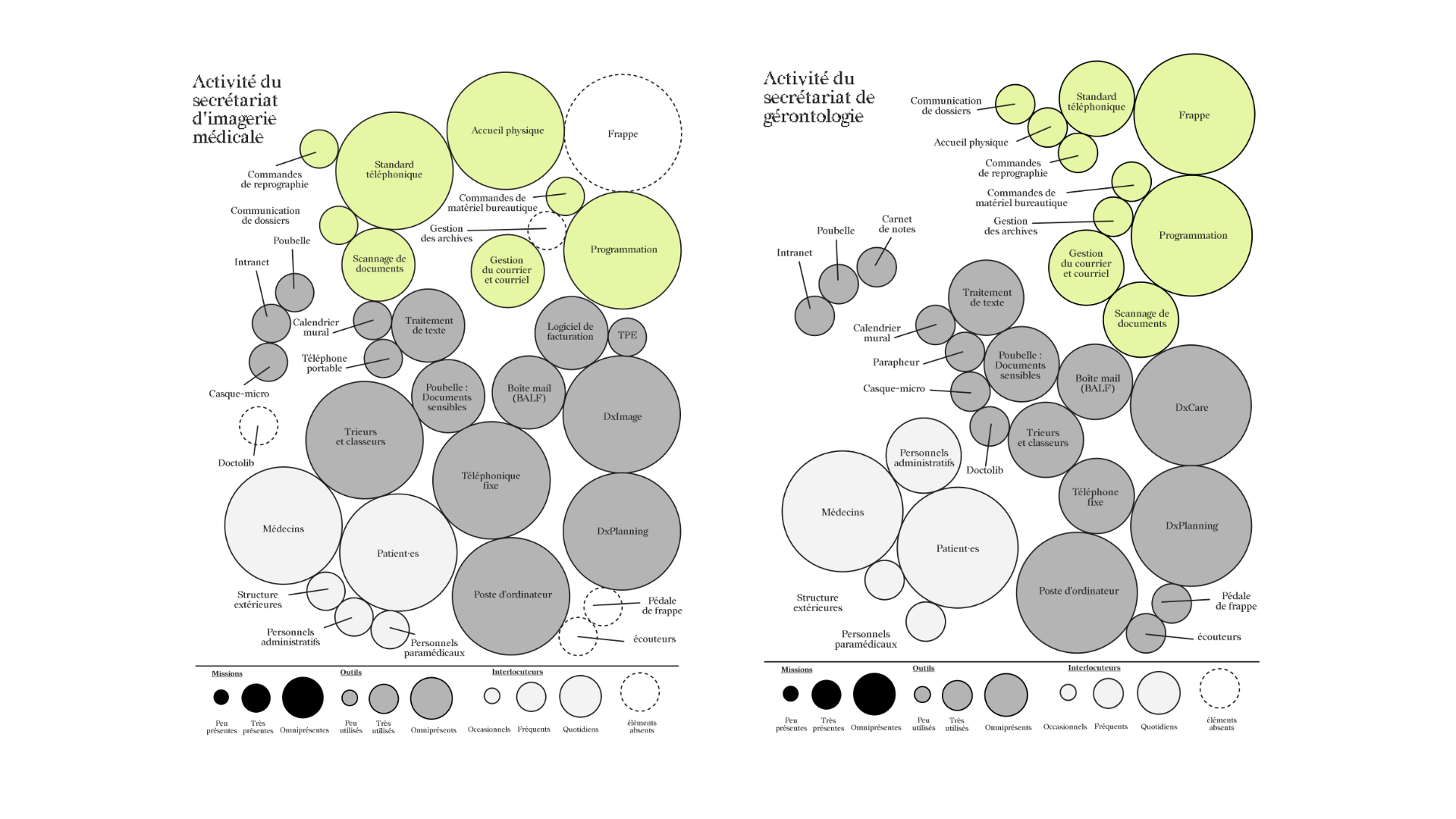 Pourquoi les secrétaires médicales sont-elles encore présentes dans les hôpitaux alors que la disparition de leur métier est annoncée depuis plusieurs décennies par une succession de discours prônant la dématérialisation de l’information ? Cette thèse propose de répondre à cette question au travers d’un contre-récit des infrastructures décrivant les conditions matérielles du travail médico-administratif des secrétaires médicales : un travail essentiel mais largement ignoré. À la lisière des infrastructures de l’information, les secrétaires médicales réalisent un ensemble d’opérations de traduction – agencer, copier, articuler, programmer, faire propre, prendre soin, etc. – qui participent à faire tenir l’hôpital et l’activité de soin qui s’y déroule. En montrant que cette forme de travail des données repose sur des environnements matériels fragiles et sur une multitude d’objets graphiques, ce travail de recherche décrit un monde où l’information ne circule jamais seule. À partir d’une enquête ethnographique au croisement des Sciences and Technology Studies (STS) et du design graphique, ce travail de recherche propose une analyse inédite du métier de secrétaire médicale, qui contribue à une approche féministe du travail des données, une critique des discours de la dématérialisation dans le champ du numérique en santé, et à l’étude des documents médico-administratifs comme des objets graphiques et politiques.