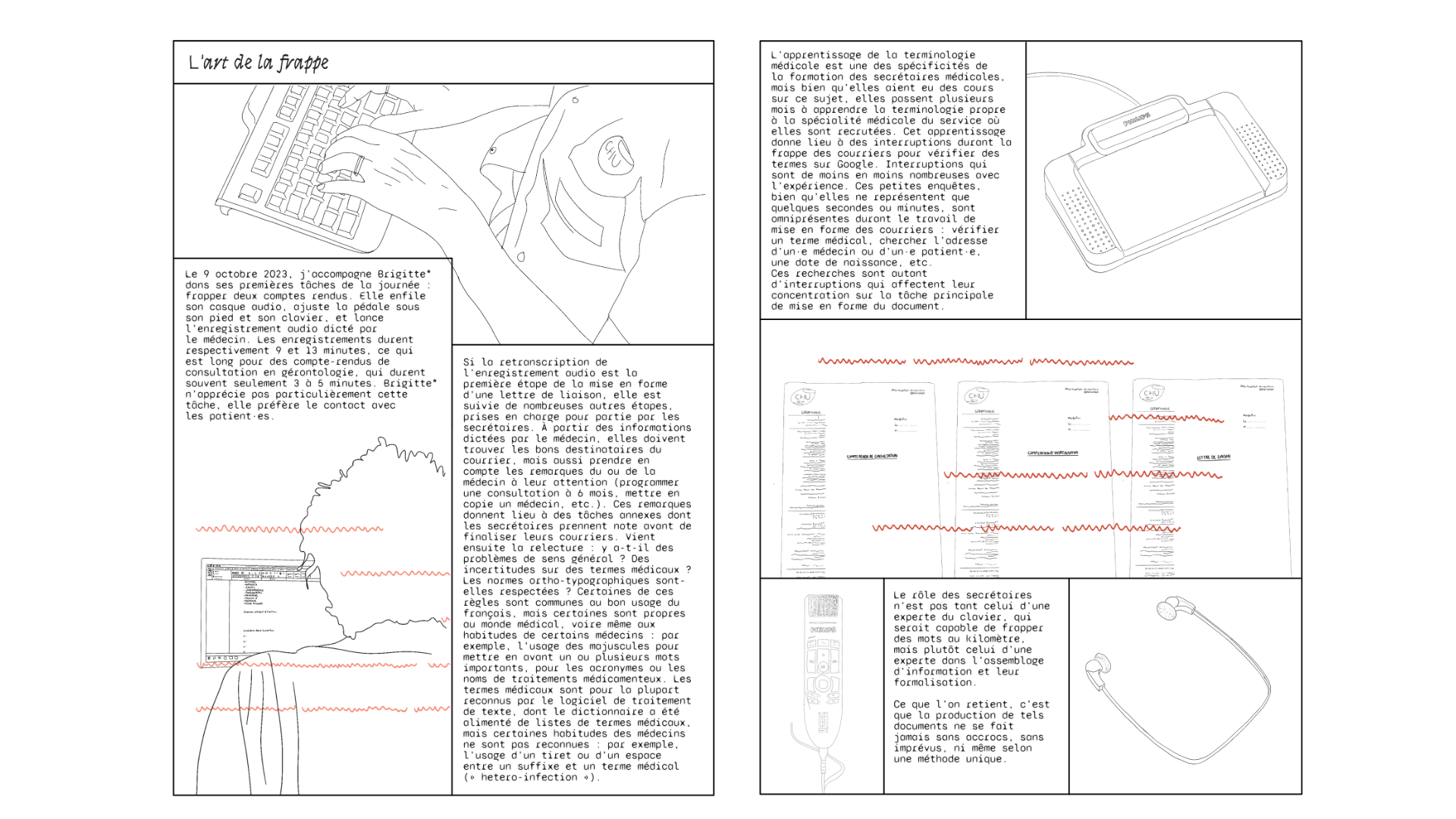 Sur les bureaux des secrétariat, les documents ne dorment jamais. Ils arrivent, repartent, sont empilés, annotés, scannés, corrigés, renommés, classés. Chacun appelle une action précise, souvent discrète, rarement reconnue. C’est à partir de cette activité ordinaire que ce chapitre pose les jalons de l’approche analytique que j'ai développée pour décrire « l’activité secrétariale » : il définit les documents médico-administratifs comme la matière qui compose le secrétariat médical et propose de les étudier en tant qu’objets graphiques. Il montre comment la normalisation des écrits professionnels au travers de documents a transformé l’organisation des administrations, et particulièrement des hôpitaux, en un système d’écriture procédurale. Les documents y opèrent comme des instruments de pouvoir et des supports d’action : ils permettent de faire savoir, faire faire, faire preuve. À l’hôpital, ils matérialisent la traduction d’informations entre sphères médicale, administrative et juridique. Pour décrire ces processus, le chapitre mobilise la notion d’opération visuelle de traduction pour décrire le travail invisible accompli par les secrétaires médicales. Ces opérations organisent l’écriture, la circulation, la lisibilité et la stabilité de l’information.